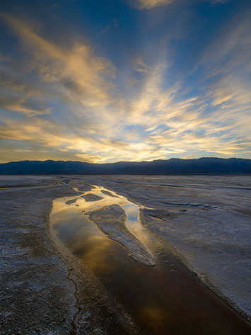 Distances are deceptive in Death Valley as the setting sun in reflected in a small pool of salty water in Cottonball Basin.