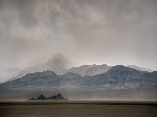 High cross winds and snow made this shoot a lot of fun. The Grandstand rock formation in the foreground almost looks like a ship under sail in these conditions. In case you're wondering, I saw no moving rocks while I was there, but I did see a small fragment of a tumbleweed streak across the playa!