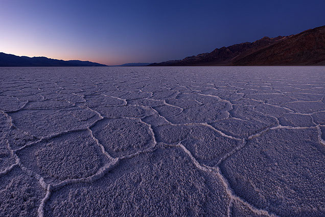 Looking toward the lowest point in Death Vally, the remnants of the setting sun bask the basin in a characteristic glow that photographers like to call "the blue hour."