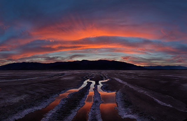 Reflections of a glowing sunset lead to eye to a silhouette of the Panamint Mountains in Death Valley.