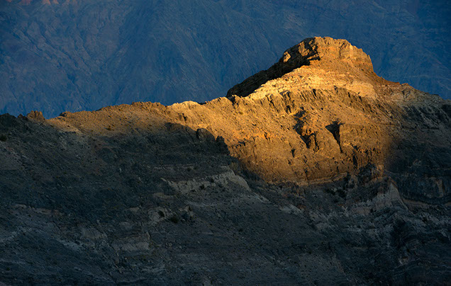 The distant peaks of the Panamint Mountains catch the first rays of light from a sunrise as seen from Zabriskie Point.