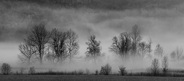 A low-lying fog creates layers of trees in the quiet dawn at the beginning of another day in Cades Cove.