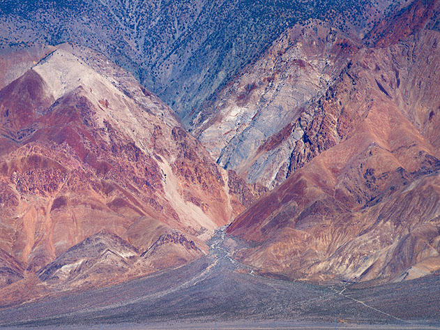 The colors and textures in this distant valley tell a story of the affects of human and natural forces on the Panamint Range on the western flank of Death Valley.