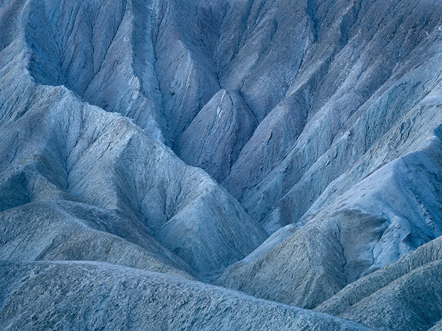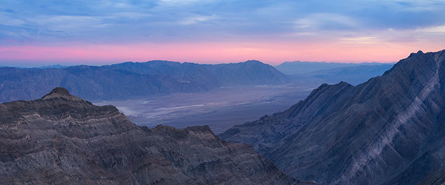 Looking toward the lowest point in Death Vally, the remnants of the setting sun bask the basin in a characteristic glow that photographers like to call "the blue hour."