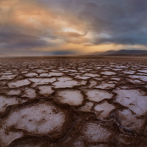 Traces of the first light of day intertwine with storm clouds moving across Death Valley.