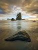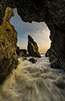 A rush of waves crashes in to hidden grotto lit by the last light of the day.